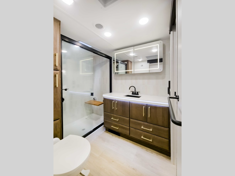 Inside, you'll enjoy solid surface countertops in the bath and kitchen, all custom cabinetry, multiple Fantastic vent fans, plus residential kitchen and dinette lighting to name a few comforts. There are many convenient exterior features as well, including 6-point hydraulic automatic leveling, an industry leading Helix pin box, a rear ladder, metal baggage doors and so much more!