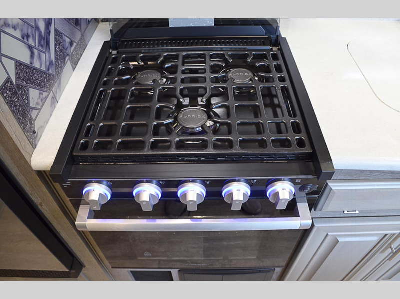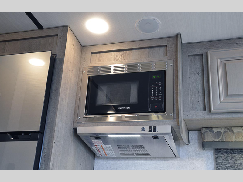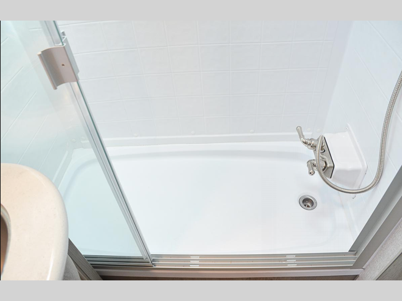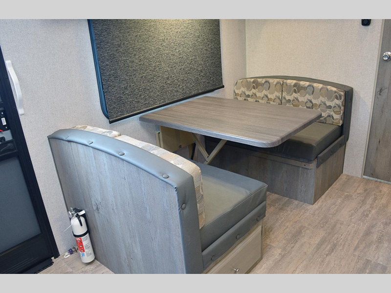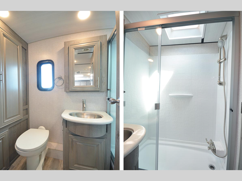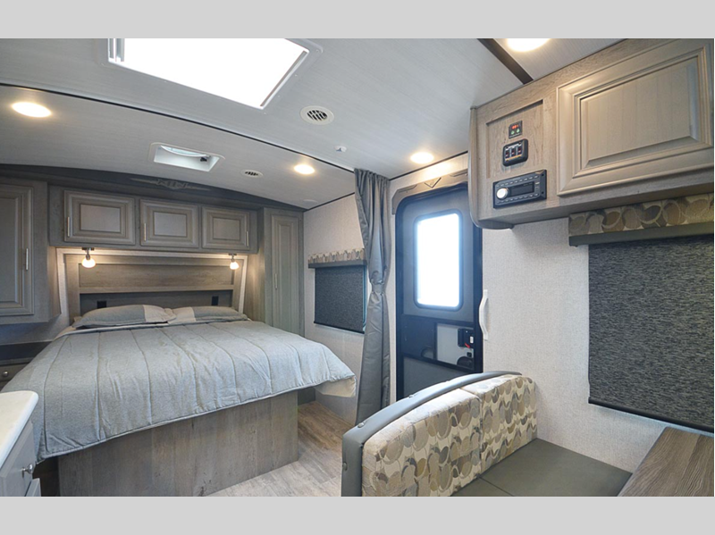 On the interior, you will find a kitchen skylight with a shade to keep the space bright and cheerful, and the USB charging ports on both sides of the bed will certainly be a major convenience. The exterior has quite a few fun features too, like the outside speakers, exterior shower, and a 12V LED awning with adjustable pitch.