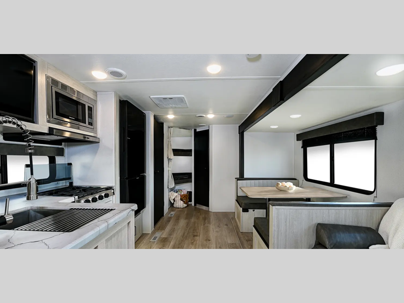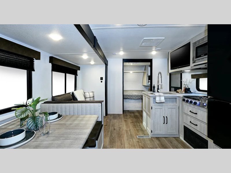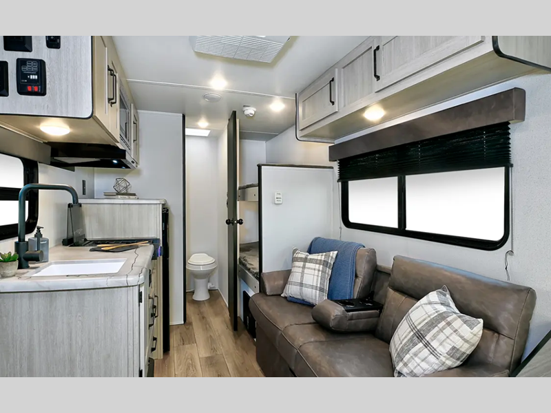 Sleeps 8 Slides 1 Length 23 ft 1 in Ext Width 7 ft 6 in Ext Height 10 ft 5 in Hitch Weight 515 lbs GVWR 5615 lbs Dry Weight 4159 lbs Cargo Capacity 1456 lbs Fresh Water Capacity 34 gals Grey Water Capacity 30 gals Black Water Capacity 30 gals Number Of Bunks 2 Available Beds RV Queen Refrigerator Type 12V Black Glass Refrigerator Size 4.3 cu ft Cooktop Burners 2 Shower Size 24" x 40" Number of Awnings 1 LP Tank Capacity 20 lbs Water Heater Capacity 6 gal Water Heater Type GE Gas/Electric AC BTU 13500 btu Axle Count 1 Shower Type Standard Similar Floorplans