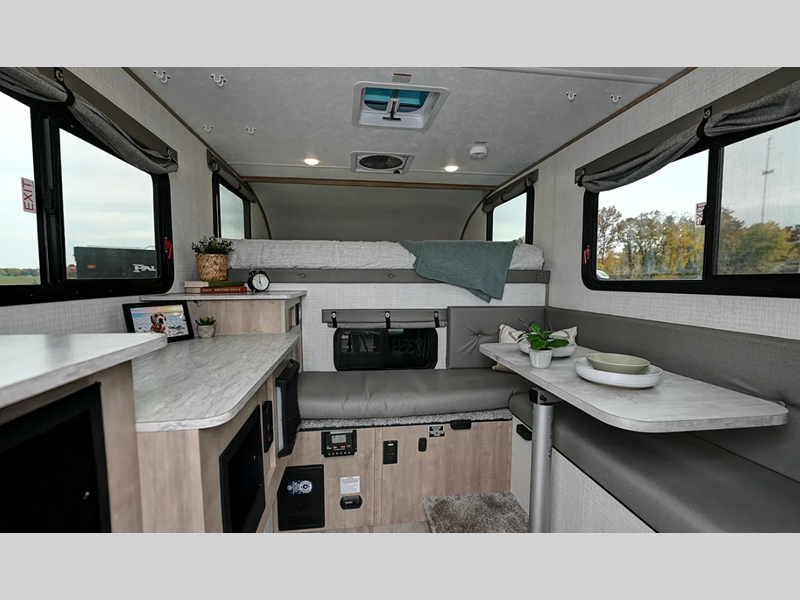 Sleeps 3 Length 12 ft 8 in Ext Width 6 ft 4 in Ext Height 6 ft Exterior Color White or Grey Dry Weight 1216 lbs Fresh Water Capacity 9 gals Furnace BTU 20000 btu Available Beds Queen Refrigerator Type 12V Refrigerator Size 3.3 cu ft Cooktop Burners 2 Floor Length 6 ft Center of Gravity Front 22 in LP Tank Capacity 20 lbs Truck Bed Size Short Number of LP Tanks 1 Body Style Pop-Up Shower Type N/A Similar Floorplans