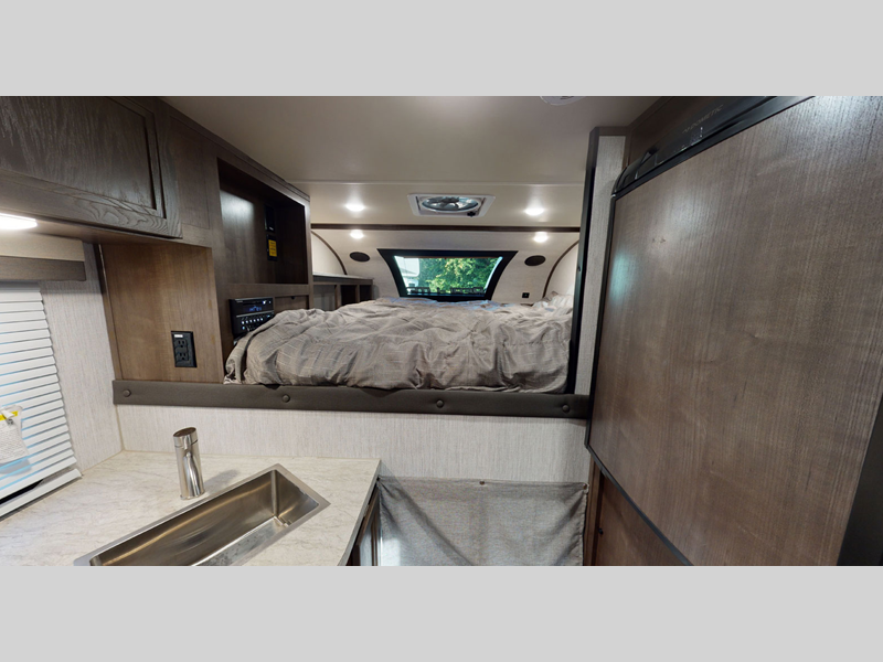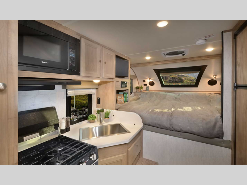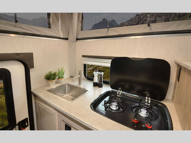 Sleeps 3 Length 18 ft Ext Width 7 ft 8 in Ext Height 8 ft 4 in Exterior Color White or Grey Dry Weight 2489 lbs Fresh Water Capacity 21 gals Grey Water Capacity 7 gals Black Water Capacity 8 gals Furnace BTU 20000 btu Available Beds Queen Refrigerator Type 12V Cooktop Burners 3 Floor Length 9 ft Center of Gravity Front 42 in LP Tank Capacity 30 lbs Water Heater Type On Demand Truck Bed Size Short/Long Number of LP Tanks 1 Body Style Hard-Side Shower Type Wet/Bath Shower -