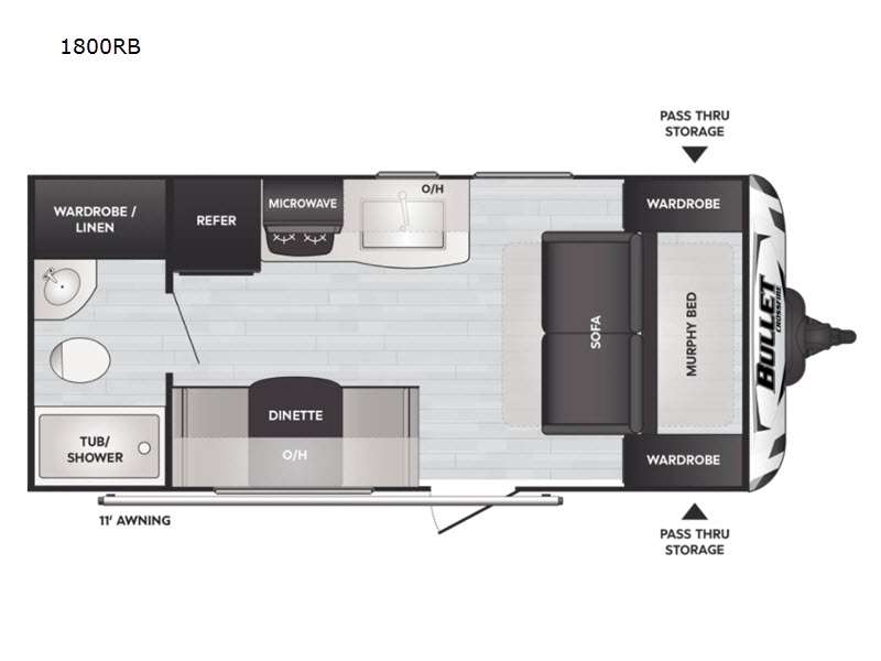 If you're looking for a versatile travel trailer, your search is over! This model includes a front Murphy bed that can be folded away in the morning so you can relax on the sofa. There is a booth dinette where you can dine, relax, and even sleep an extra guest or two small children. The spacious full rear bath includes a wardrobe/linen closet to clean up each day, and a tub/shower that will be perfect for little ones. You'll find plenty of storage space for all your belongings, including overhead compartments, dual bedroom wardrobes, and an exterior pass-through storage for fishing poles!